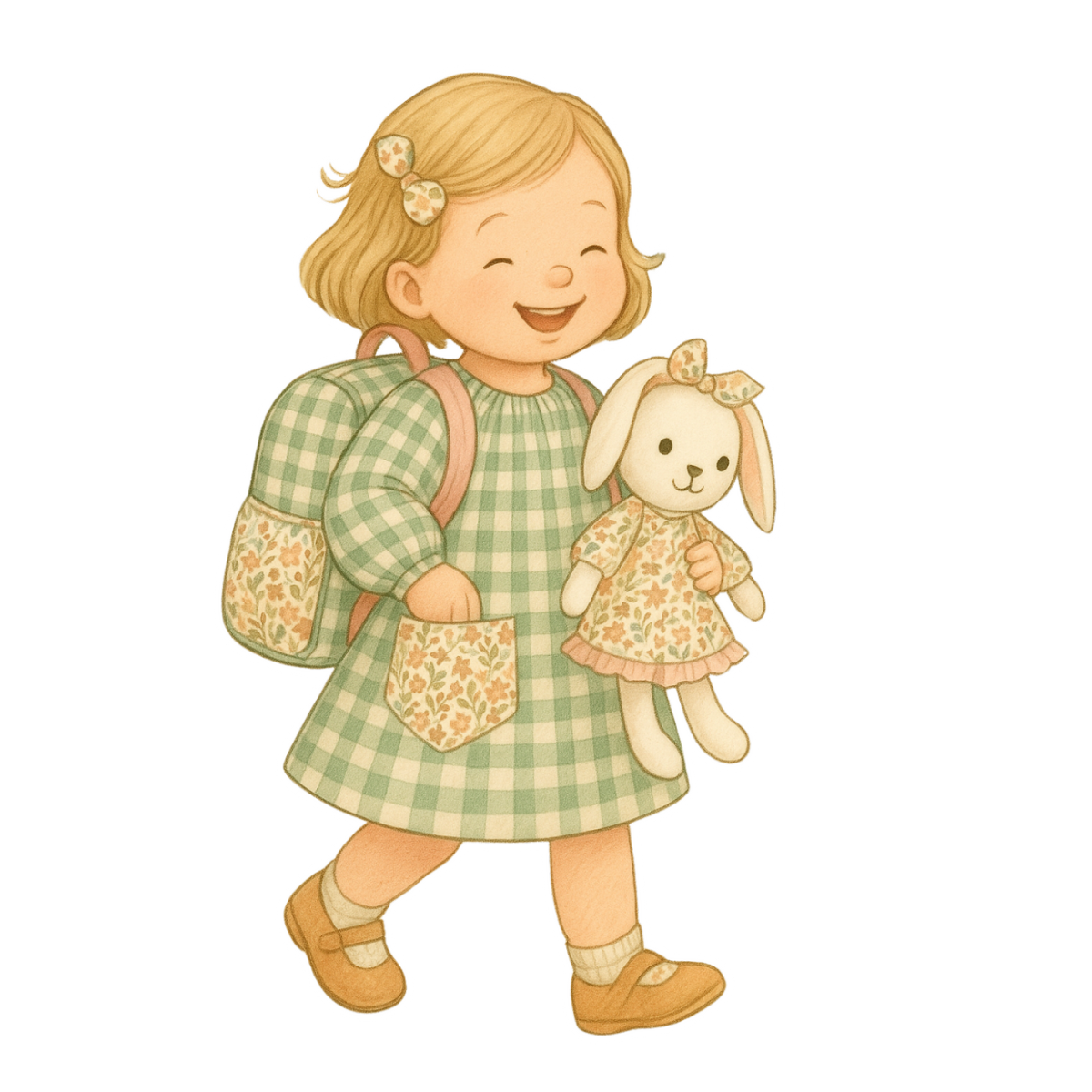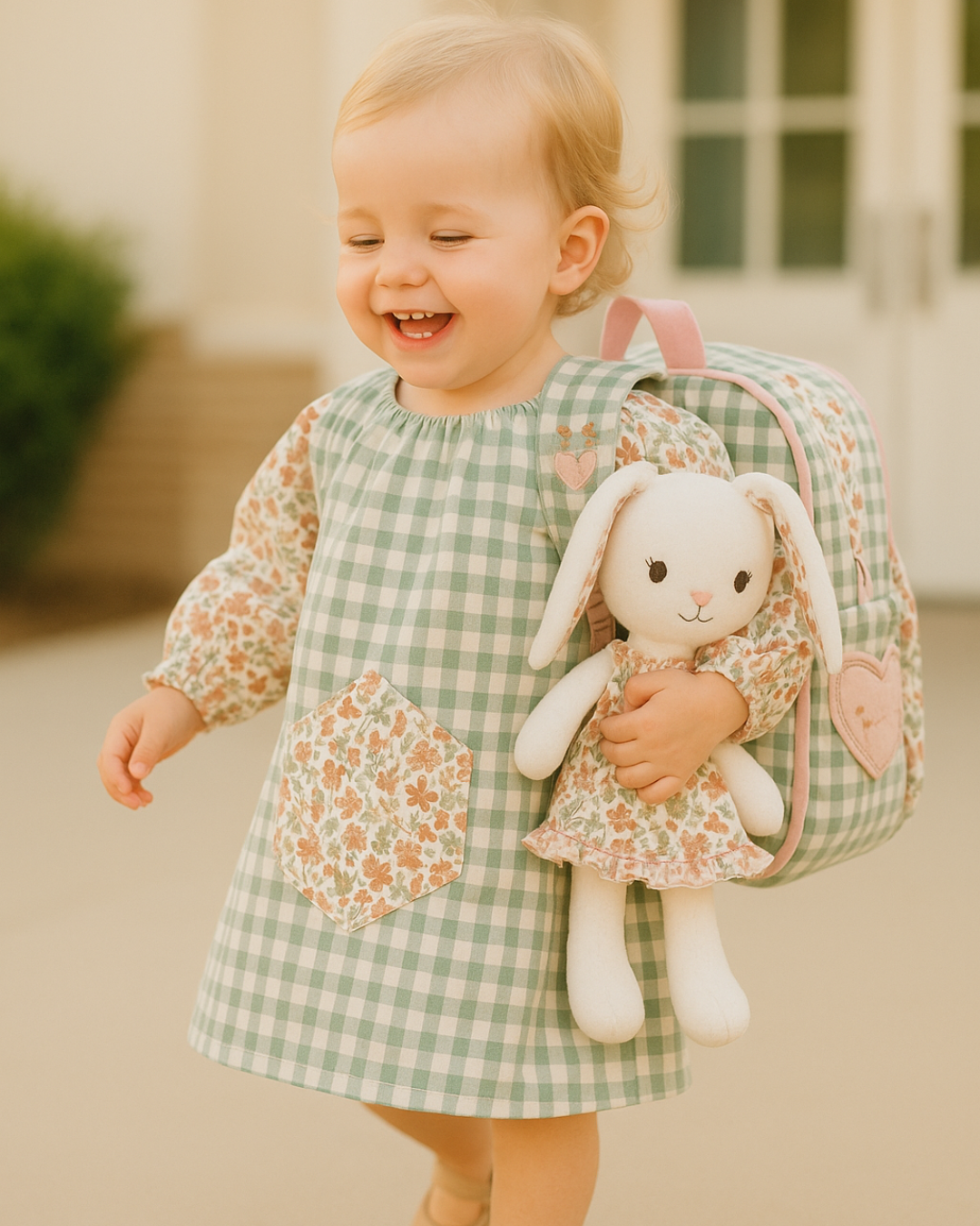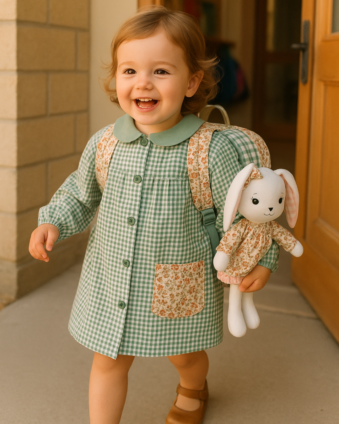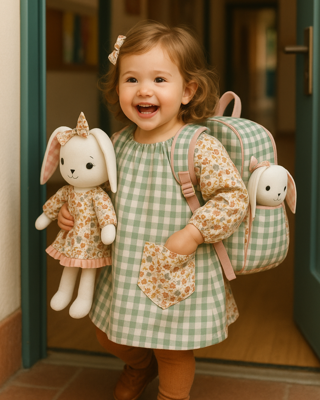 Es ver a tu hija, nieto, tu sobrina, a ese bebé tan especial entrar feliz al cole… con un conjunto único, una mochila hecha a mano, y un adorable peluche que llevará pegado a su corazón.